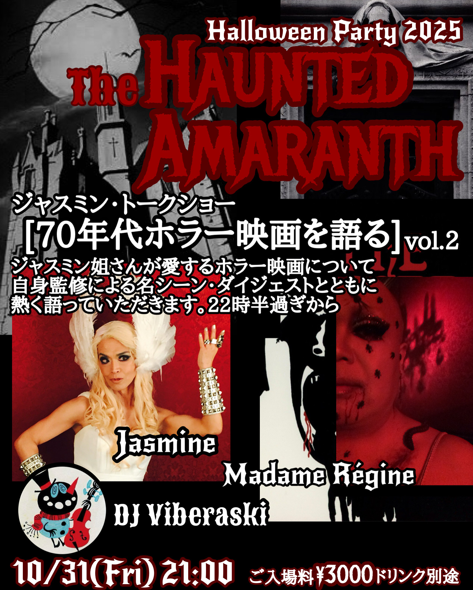 ★ 悪夢のメインイベントは、ホラー映画をこよなく愛する[ジャスミン姐さんトークショー]!秘蔵の70年代ホラー映画・名シーン・ダイジェストと共にその恐ろしい鑑賞ポイントを熱く語っていただきます。22時半頃から。