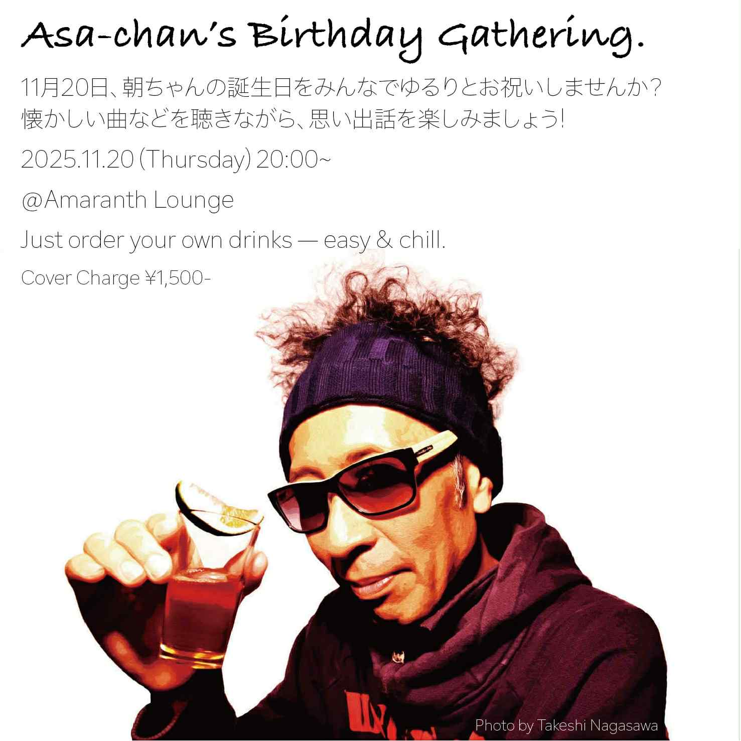 朝ちゃんが逝かれて10年になりますが、朝ちゃんのお誕生日の11月20日、朝ちゃんを好きな人、朝本さんの音楽が好きな人々に集まっていただき、彼のお誕生日を気楽にお祝い出来ればと、ナターシャと陽一郎の2人が発起人となり、アマランスにて[Asa-chan’s Birthday Gathering]を開催することとなりました。